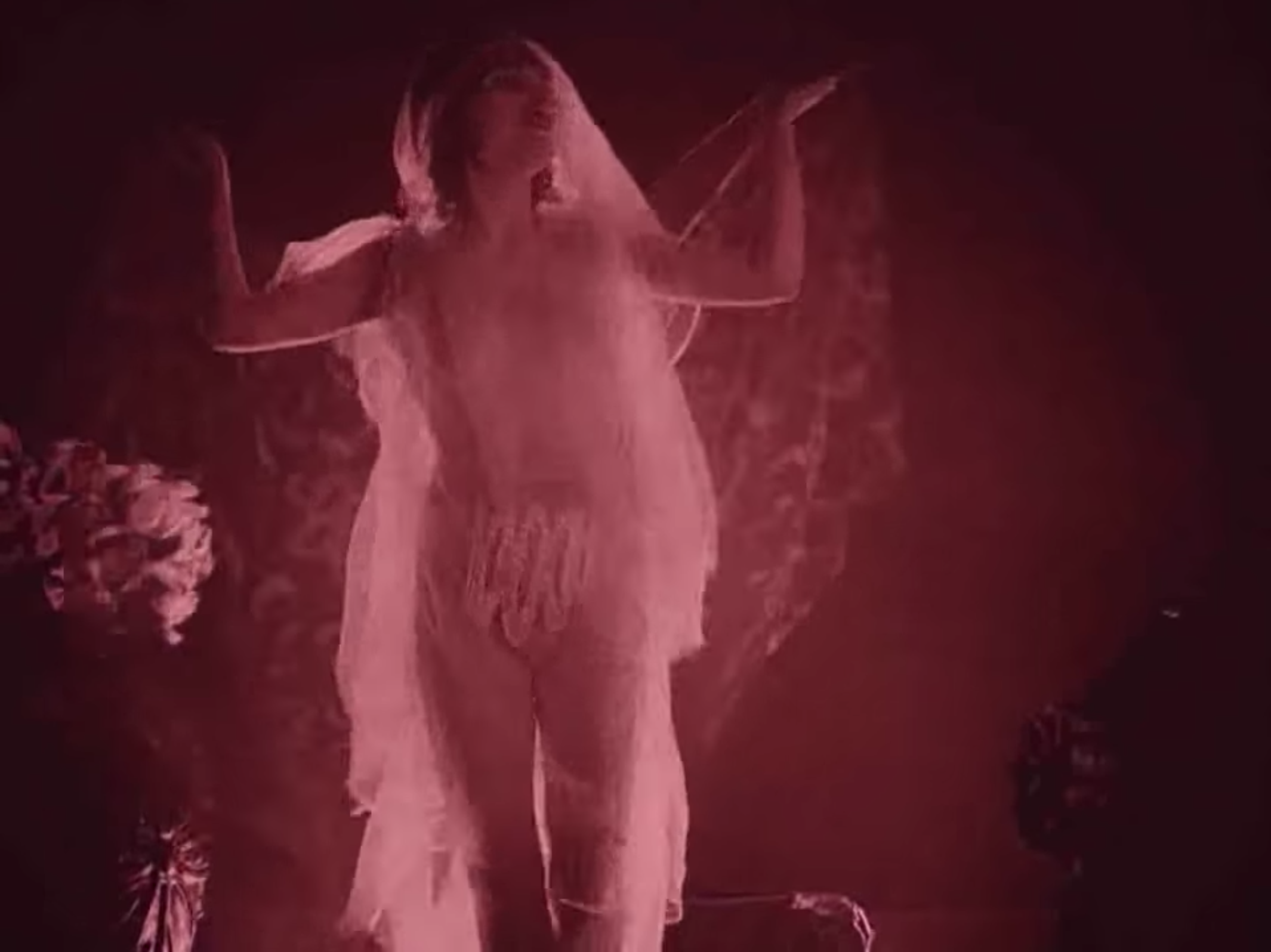 Suddenly, the WIFE OF THE GODLY MAN bursts through the door. The GODLY MEN all leap to their feet. Now the image of a dancing girl is projected onto the face of the GODLY MAN. Phantom eyes on his eyes. The lips of a French actress behind a veil projected on his lips. She opens her mouth. We see the tip of her tongue.